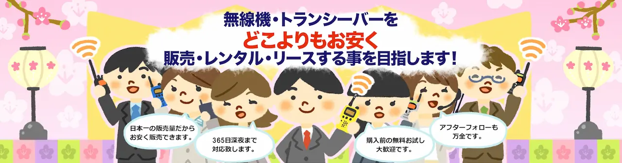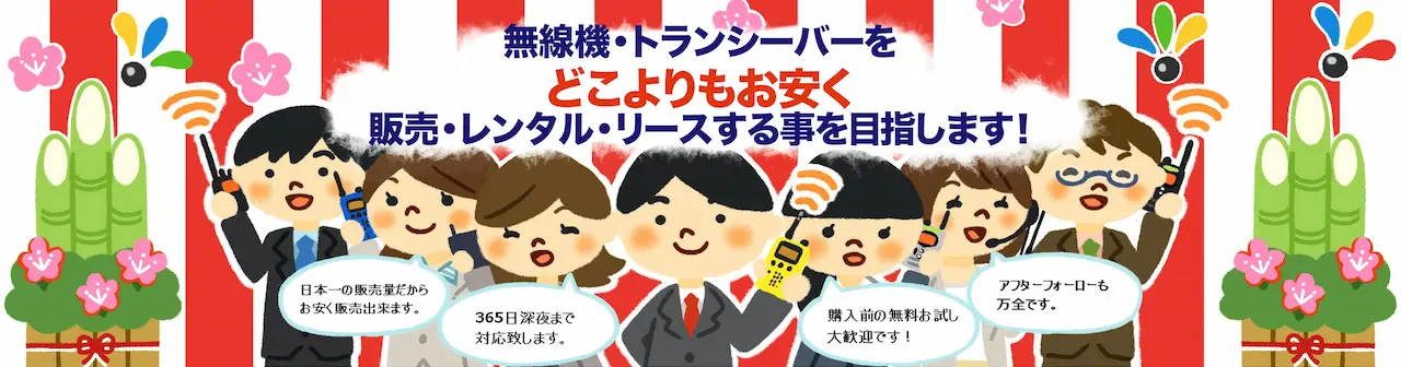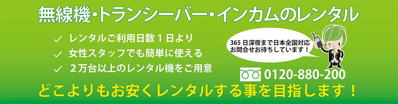 無線機・トランシーバー・インカムをどこよりもお安く販売、レンタルする事を目指します。他社よりも1円でも高ければご相談ください!また、ほぼ全機種で購入前の無料お試しが可能です。ご予算に応じて最適なご提案を致しますので、まずはお気軽にご相談ください。
